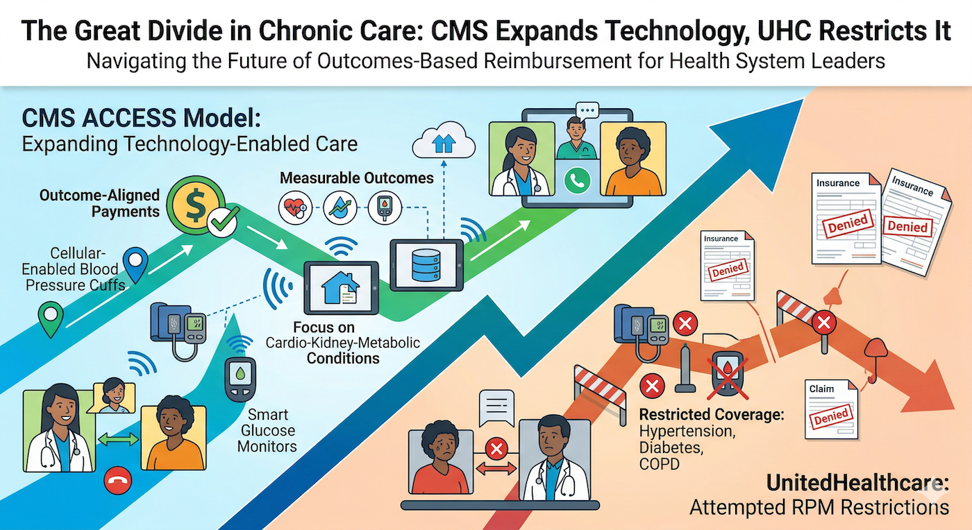 TL;DR: CMS is launching the ACCESS model in July 2026, a 10-year initiative that ties chronic care payments directly to measurable patient outcomes rather than time-based billing. At the same time, UnitedHealthcare tried to gut RPM coverage for chronic hypertension, diabetes, and COPD, only to postpone after industry backlash. These opposing moves create a defining moment for health system leaders. The future of chronic care reimbursement is outcome-aligned, and organizations that can deliver measurable results through technology-supported clinical programs will capture the opportunity. Those waiting for universal payer alignment before investing will fall behind.